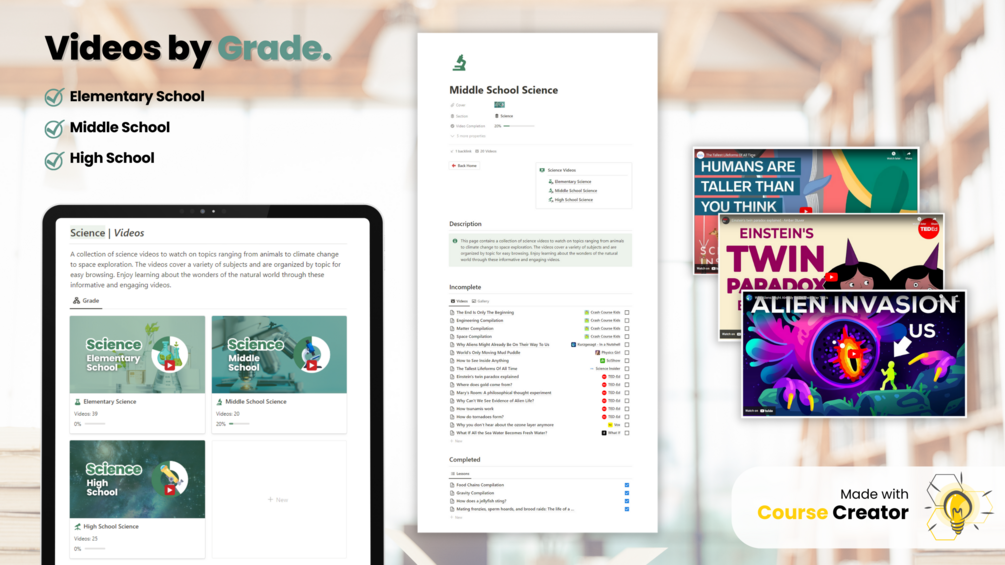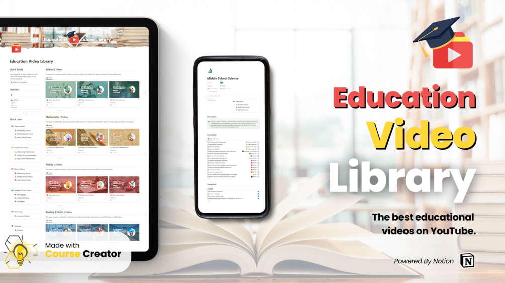 This template is a library of the best educational videos on YouTube. No need to waste time searching for educational material—it has all been put together in one easy-to-find place. There are over 250 videos from 40 different educational YouTube channels organized by subject and grade. This is the perfect resource for any teacher needing educational material for their students or if you are just looking to educate yourself.
