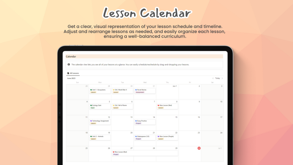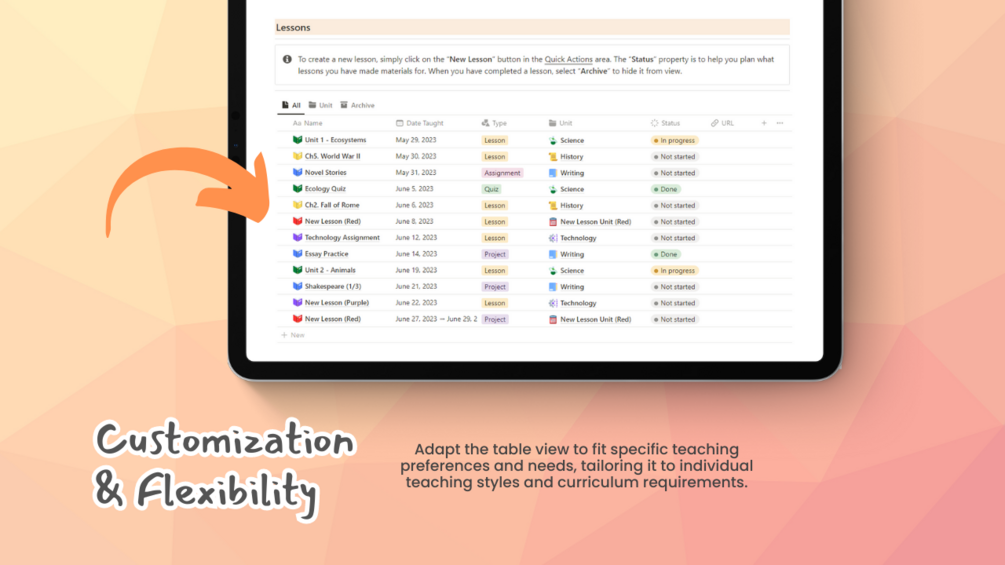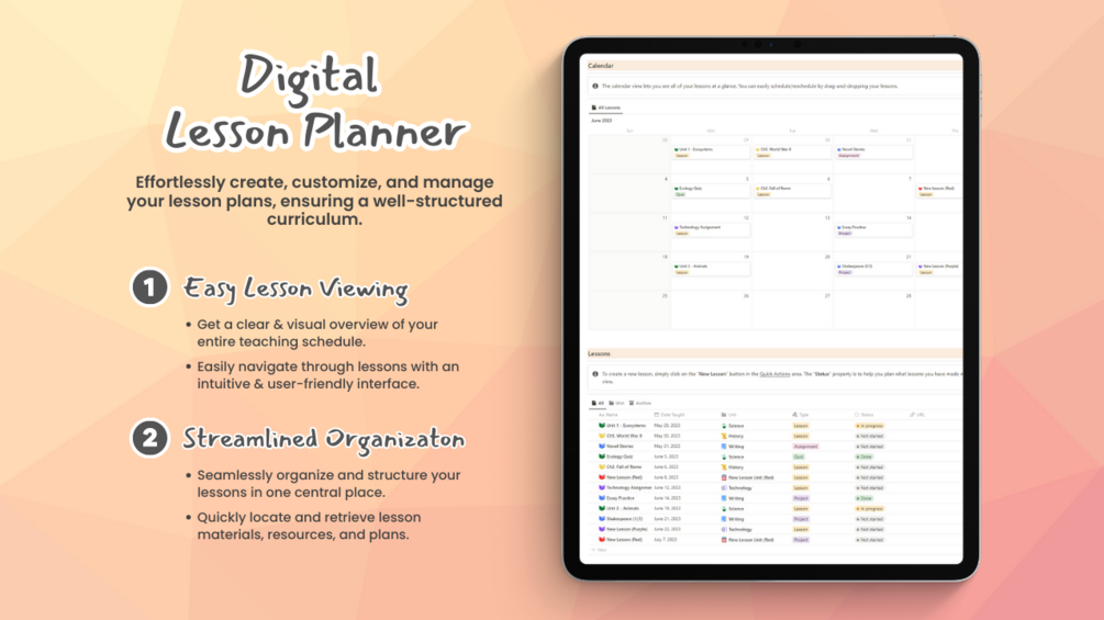 This all-in-one template equips teachers with the tools they need to effortlessly create, organize, and modify lesson plans, saving valuable time and eliminating the stress of manual record-keeping. With two dedicated databases for lesson units and individual lessons, along with an intuitive table view and calendar view, teachers can easily navigate through their curriculum, drag and drop lessons, and stay meticulously organized. Say goodbye to the overwhelming paperwork and experience the joy of streamlined lesson planning.